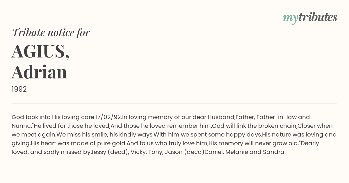 God took into His loving care 17/02/92.