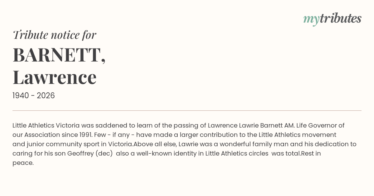 Little Athletics Victoria was saddened to learn of the passing of Lawrence ‘Lawrie’ Barnett AM. Life Governor of our Association since 1991. Few - if any - have made a larger contribution to the Little Athletics movement and junior community sport in Victoria.