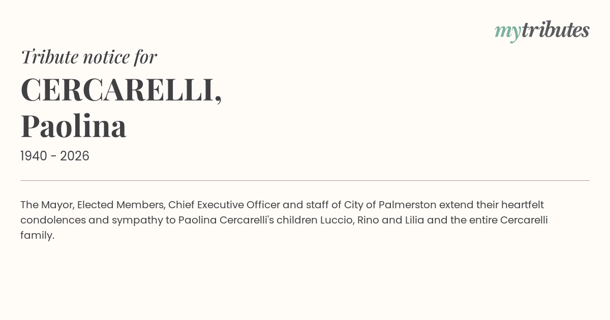 The Mayor, Elected Members, Chief Executive Officer and staff of City of Palmerston extend their heartfelt condolences and sympathy to Paolina Cercarelli's children Luccio, Rino and Lilia and the entire Cercarelli family.