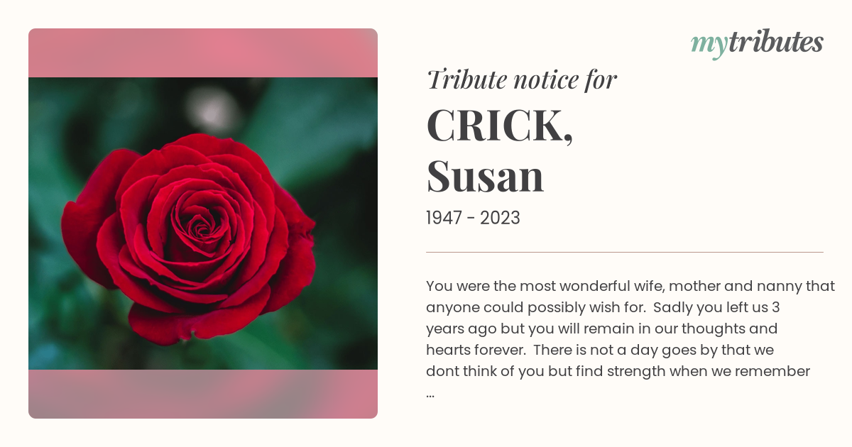 You were the most wonderful wife, mother and nanny that anyone could possibly wish for. Sadly you left us 3 years ago but you will remain in our thoughts and hearts forever. There is not a day goes by that we dont think of you but find strength when we remember your saying "You Gotta Laugh" Evan, Emma, Georgina,Amber,Tain, Eve, Oscar, Allan & Adam.