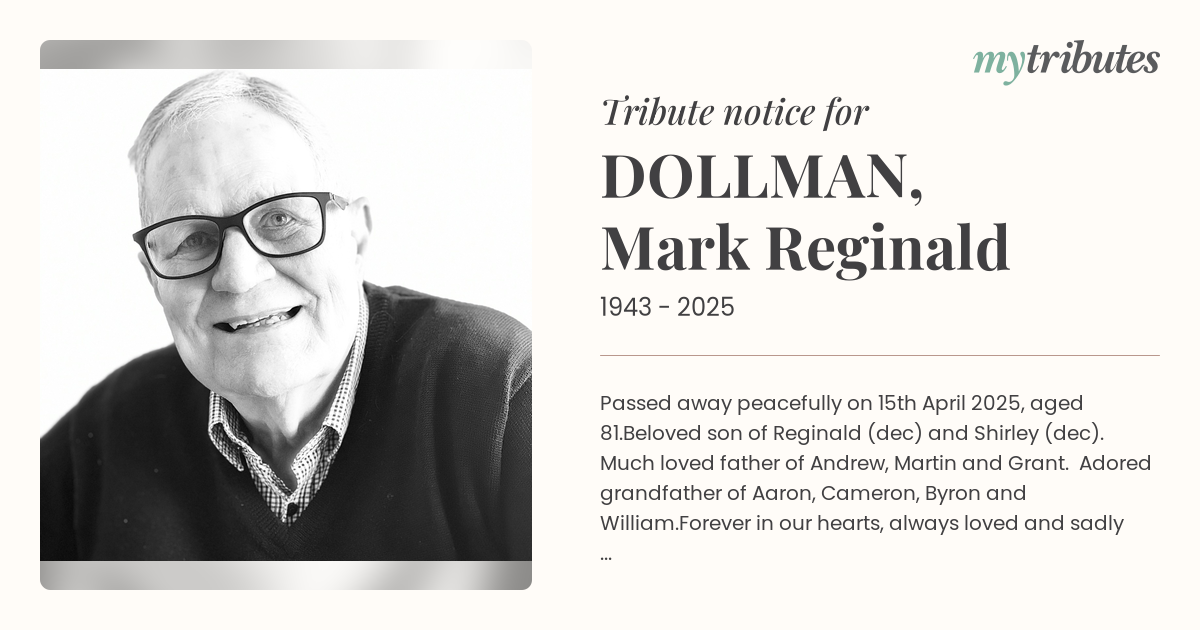 Beloved son of Reginald (dec) and Shirley (dec). Much loved father of Andrew, Martin and Grant. Adored grandfather of Aaron, Cameron, Byron and William.