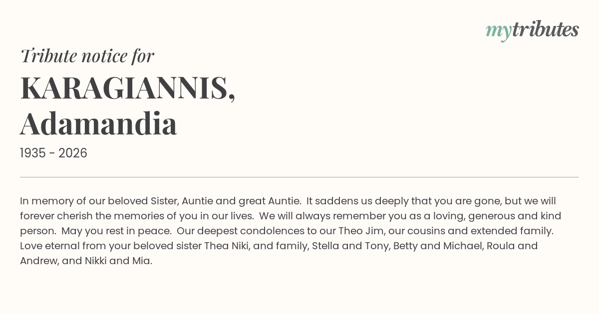 In memory of our beloved Sister, Auntie and great Auntie. It saddens us deeply that you are gone, but we will forever cherish the memories of you in our lives. We will always remember you as a loving, generous and kind person. May you rest in peace. Our deepest condolences to our Theo Jim, our cousins and extended family. Love eternal from your beloved sister Thea Niki, and family, Stella and Tony, Betty and Michael, Roula and Andrew, and Nikki and Mia.