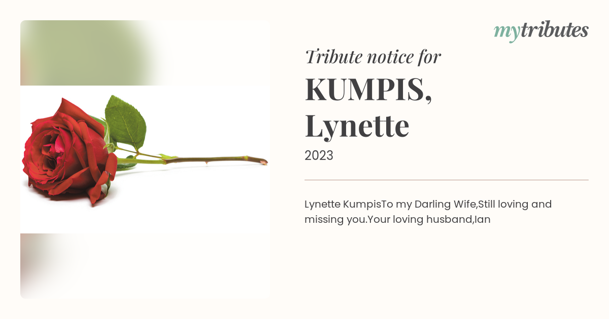 Lynette KumpisTo my Darling Wife,Still loving and missing you.Your loving husband,Ian