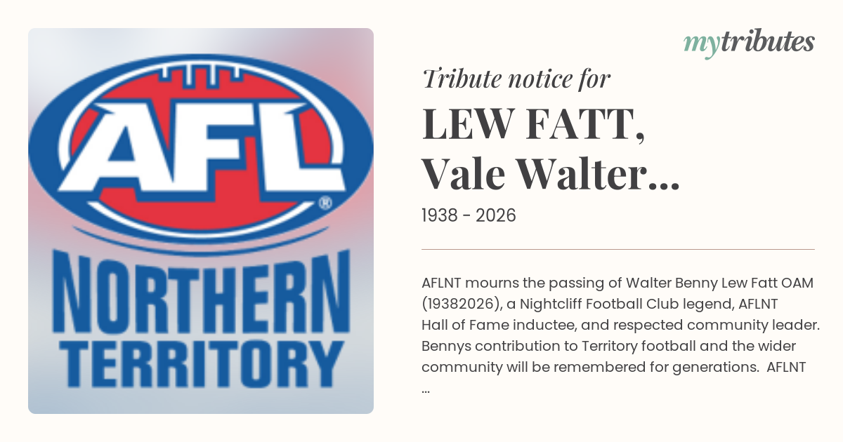 AFLNT mourns the passing of Walter “Benny” Lew Fatt OAM (1938–2026), a Nightcliff Football Club legend, AFLNT Hall of Fame inductee, and respected community leader. Benny’s contribution to Territory football and the wider community will be remembered for generations. AFLNT extends its deepest condolences to his family, friends, and the Nightcliff Football Club.