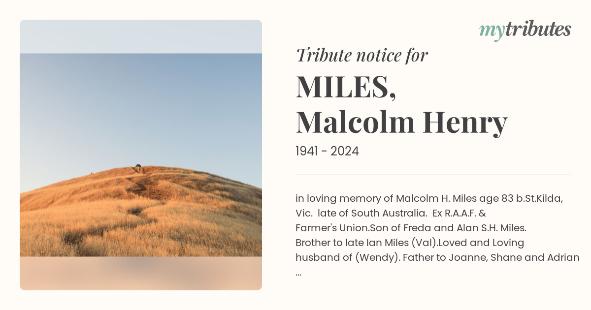 in loving memory of Malcolm H. Miles age 83 b.St.Kilda, Vic. late of South Australia. Ex R.A.A.F. & Farmer's Union.