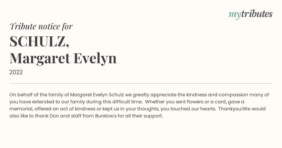 On behalf of the family of Margaret Evelyn Schulz we greatly appreciate the kindness and compassion many of you have extended to our family during this difficult time. Whether you sent flowers or a card, gave a memorial, offered an act of kindness or kept us in your thoughts, you touched our hearts. Thankyou!
