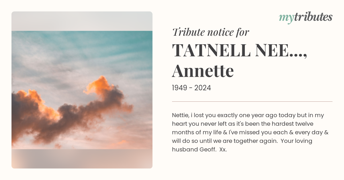 Nettie, i lost you exactly one year ago today but in my heart you never left as it's been the hardest twelve months of my life & I've missed you each & every day & will do so until we are together again. Your loving husband Geoff. Xx.
