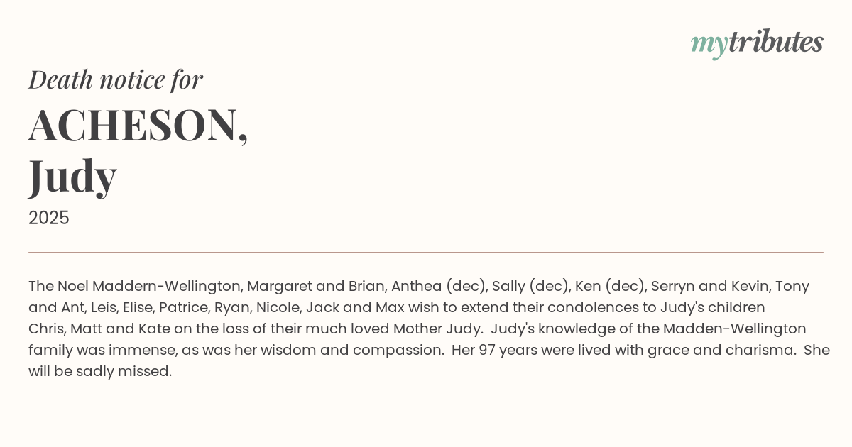 The Noel Maddern-Wellington, Margaret and Brian, Anthea (dec), Sally (dec), Ken (dec), Serryn and Kevin, Tony and Ant, Leis, Elise, Patrice, Ryan, Nicole, Jack and Max wish to extend their condolences to Judy's children Chris, Matt and Kate on the loss of their much loved Mother Judy.
