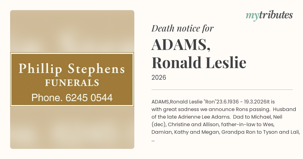 It is with great sadness we announce Ron’s passing. Husband of the late Adrienne Lee Adams. Dad to Michael, Neil (dec), Christine and Allison, father-in-law to Wes, Damian, Kathy and Megan, Grandpa “Ron” to Tyson and Lali, Phoebe and John, Lachlan and Karla, Cameron, Isaac, Nic, Connor and Te, Kate and Carly, Eliza, Harrison, Rachel and Caleb, and Liam, Great-Grandad to Riley. His life was wonderfully varied – family first always, alongside scouting, bushwalking, sailing, horse-riding. This was superbly balanced with extraordinary service to Tasmania’s people through his work with the HEC, Relationships Australia, Church leadership and primary school student and adult mentoring.