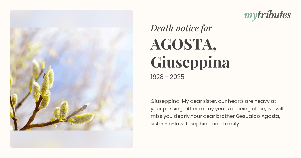 Giuseppina, My dear sister, our hearts are heavy at your passing. After many years of being close, we will miss you dearly.