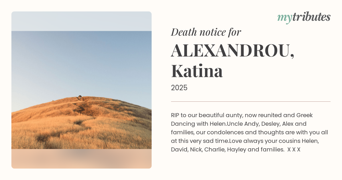 Uncle Andy, Desley, Alex and families, our condolences and thoughts are with you all at this very sad time.
