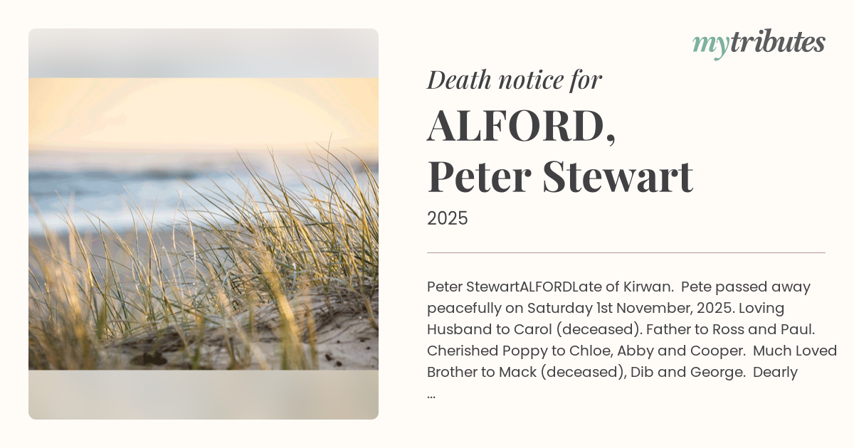 Late of Kirwan. Pete passed away peacefully on Saturday 1st November, 2025. Loving Husband to Carol (deceased). Father to Ross and Paul. Cherished Poppy to Chloe, Abby and Cooper. Much Loved Brother to Mack (deceased), Dib and George. Dearly loved by all of his Family and Friends.