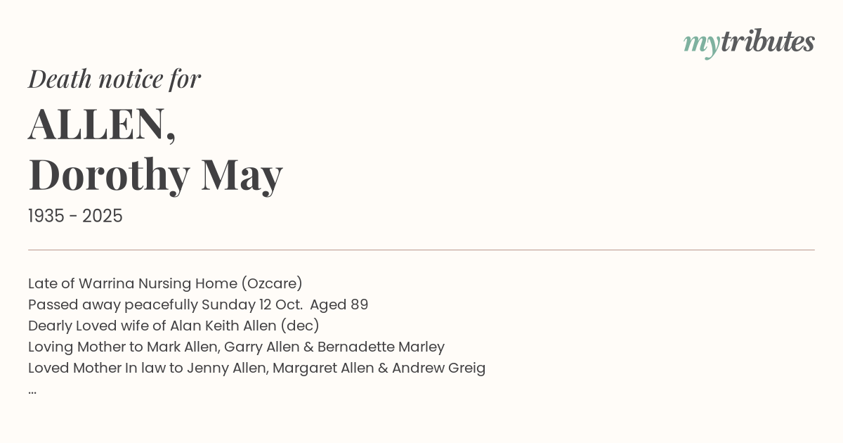 Passed away peacefully Sunday 12 Oct. Aged 89