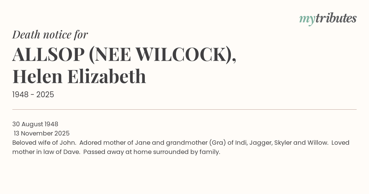 Beloved wife of John. Adored mother of Jane and grandmother (Gra) of Indi, Jagger, Skyler and Willow. Loved mother in law of Dave. Passed away at home surrounded by family.