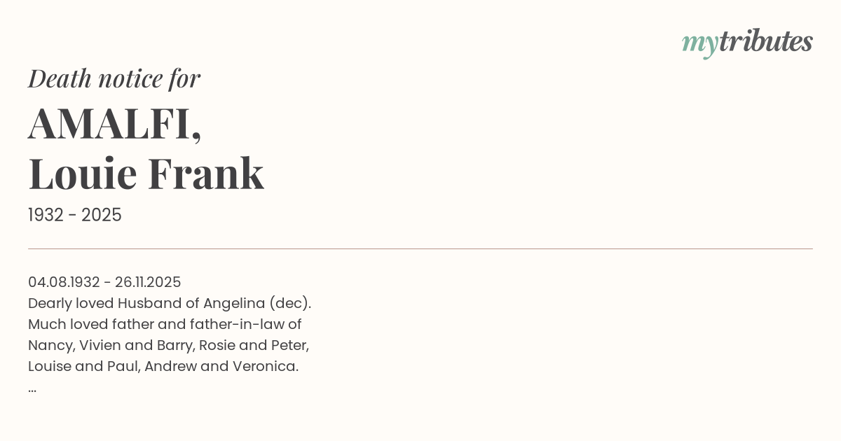 04.08.1932 - 26.11.2025 Dearly loved Husband of Angelina (dec). Much loved father and father-in-law of Nancy, Vivien and Barry, Rosie and Peter, Louise and Paul, Andrew and Veronica. Adored Nonno of Michael and Sarah, Natalie, Laura and Rob, Harrison, Charlotte, Ethan, Mia and Bisnonno of Chloe and Darcy. Our love for you will be forever in our hearts.