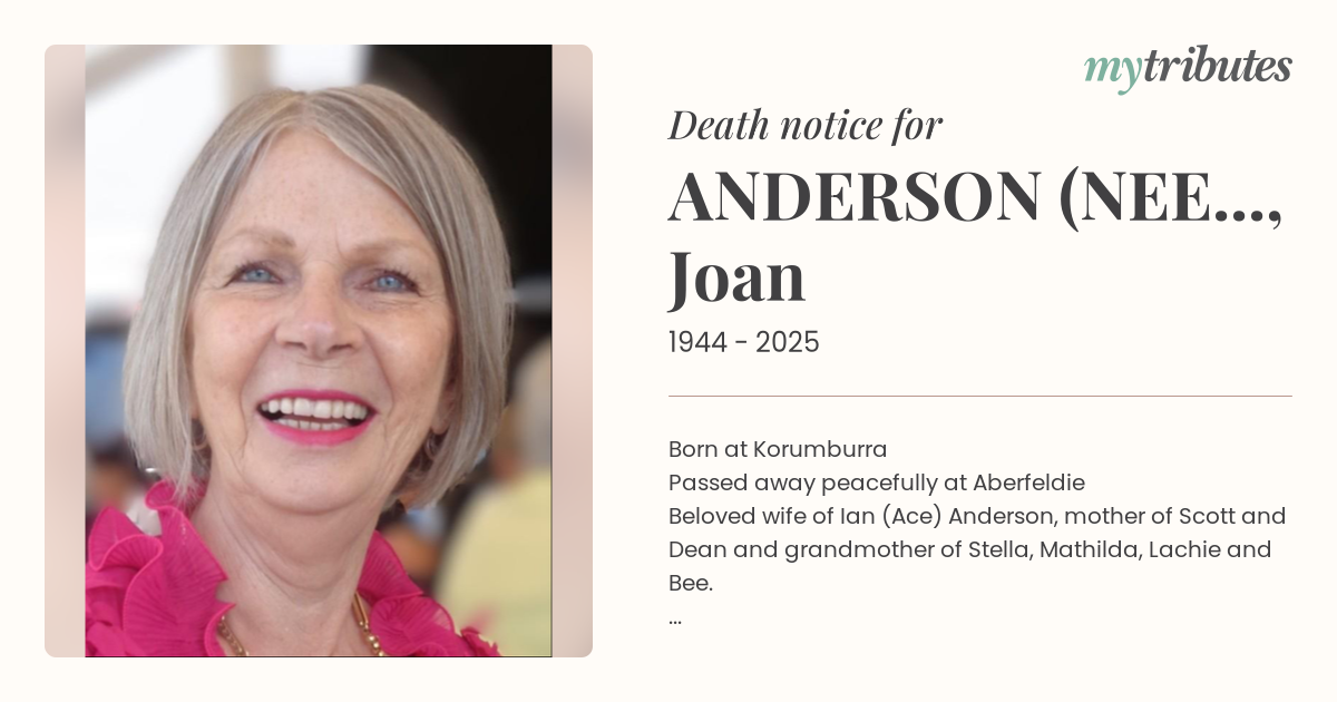 Beloved wife of Ian (Ace) Anderson, mother of Scott and Dean and grandmother of Stella, Mathilda, Lachie and Bee.
