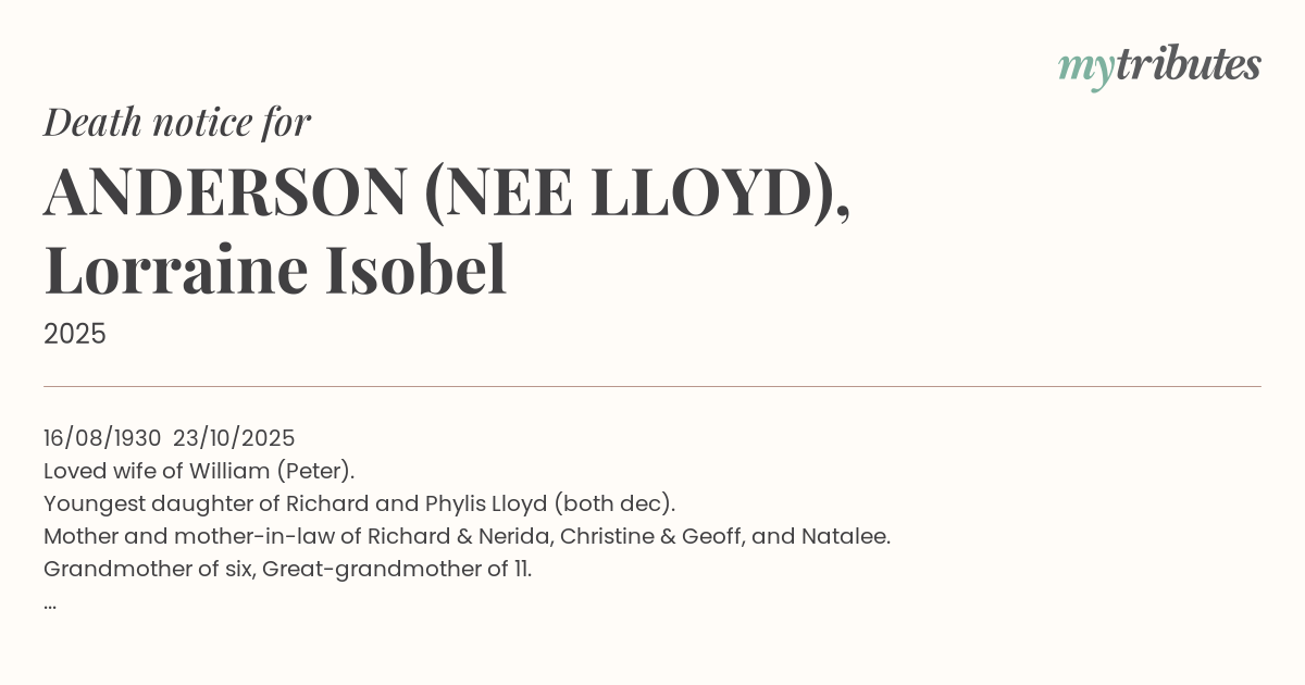 16/08/1930 – 23/10/2025 Loved wife of William (Peter). Youngest daughter of Richard and Phylis Lloyd (both dec). Mother and mother-in-law of Richard & Nerida, Christine & Geoff, and Natalee. Grandmother of six, Great-grandmother of 11. With special thanks to the staff at Bupa Belmont for their compassionate care of Lorraine over the past four years.