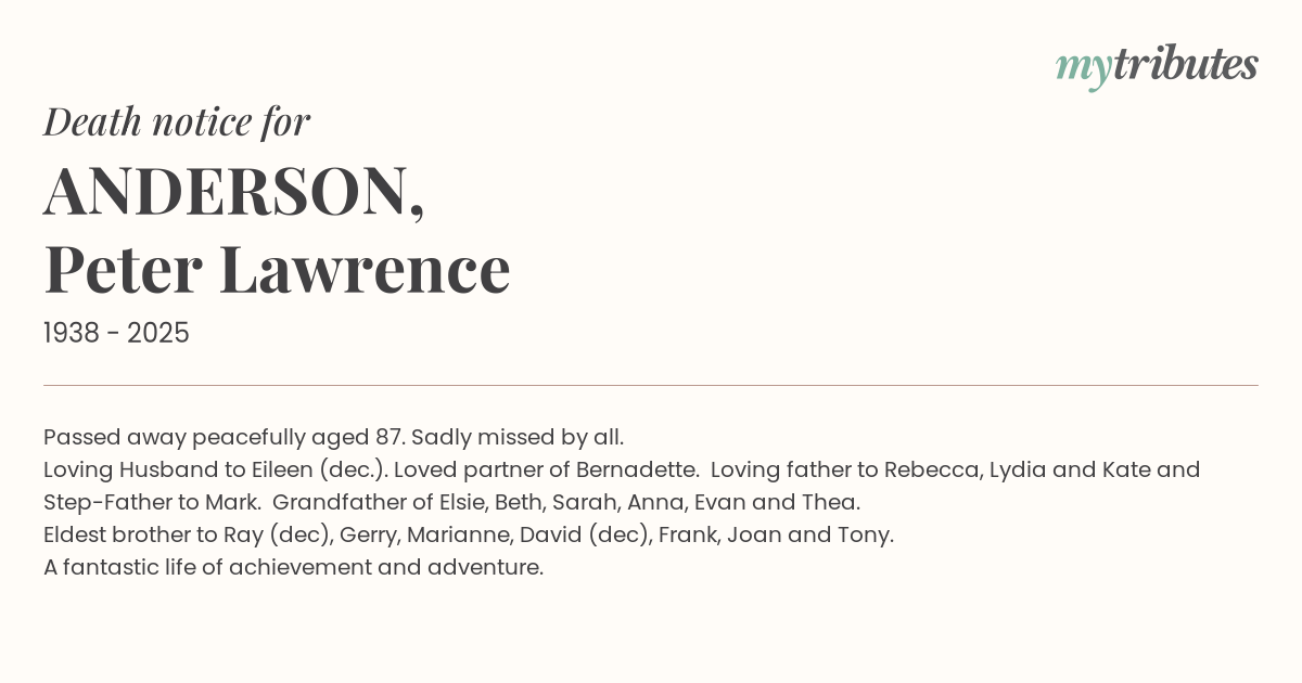 Loving Husband to Eileen (dec.). Loved partner of Bernadette. Loving father to Rebecca, Lydia and Kate and Step-Father to Mark. Grandfather of Elsie, Beth, Sarah, Anna, Evan and Thea.