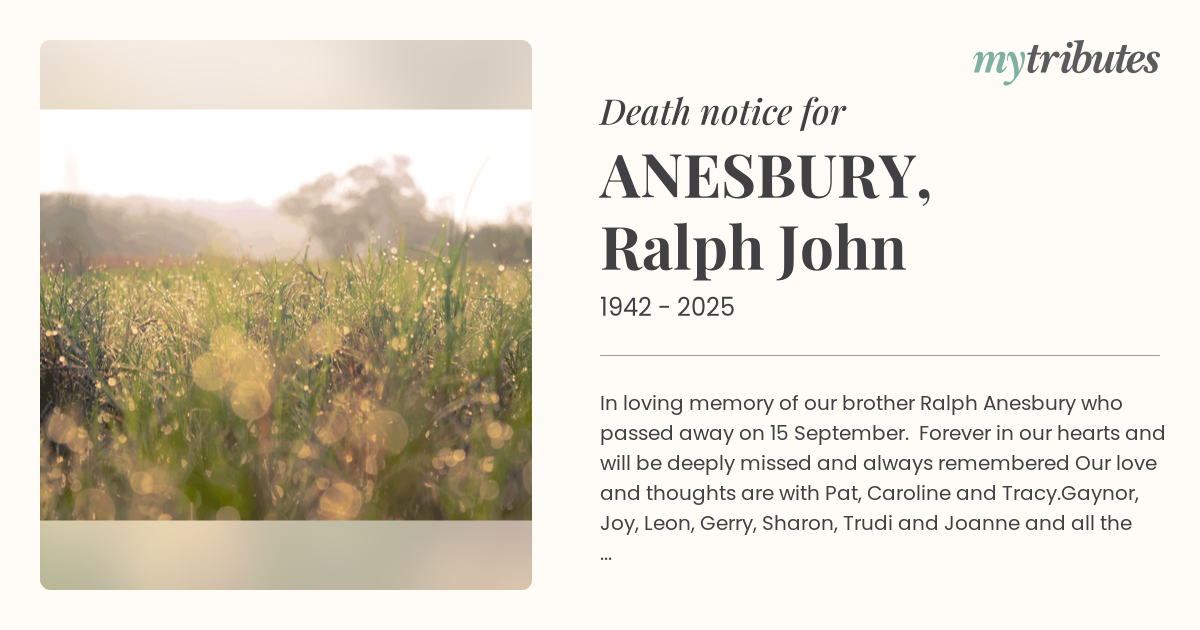 In loving memory of our brother Ralph Anesbury who passed away on 15 September. Forever in our hearts and will be deeply missed and always remembered Our love and thoughts are with Pat, Caroline and Tracy.