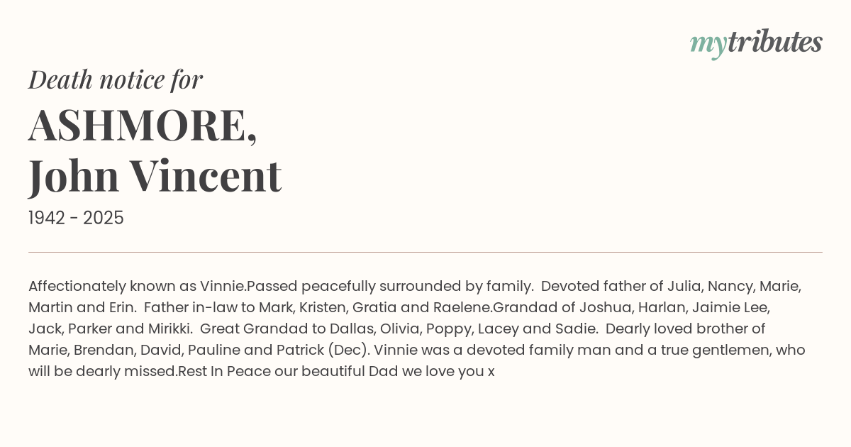 Vinnie was a devoted family man and a true gentlemen, who will be dearly missed.