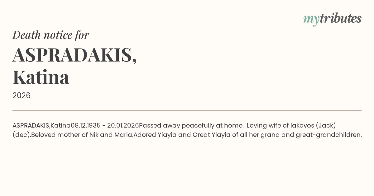 Passed away peacefully at home. Loving wife of Iakovos (Jack) (dec).
