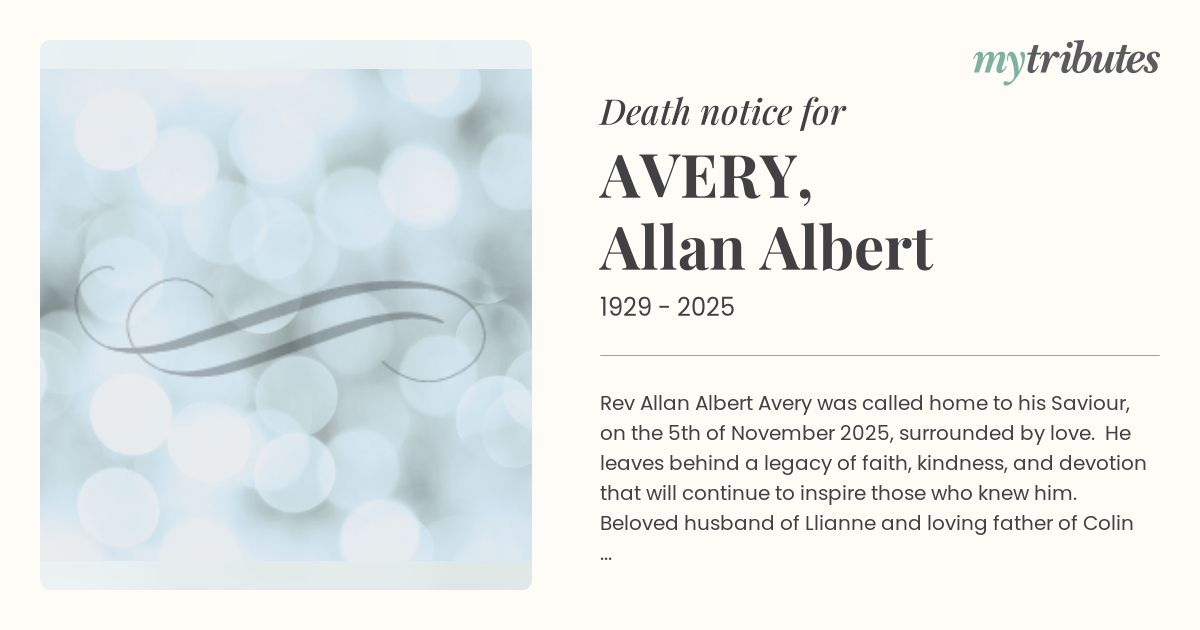 Rev Allan Albert Avery was called home to his Saviour, on the 5th of November 2025, surrounded by love. He leaves behind a legacy of faith, kindness, and devotion that will continue to inspire those who knew him. Beloved husband of Llianne and loving father of Colin (and Jill), Peter (and Rebecca), Neville and Judy (and Marcus). Cherished grandfather of eight and proud great-grandfather of three.