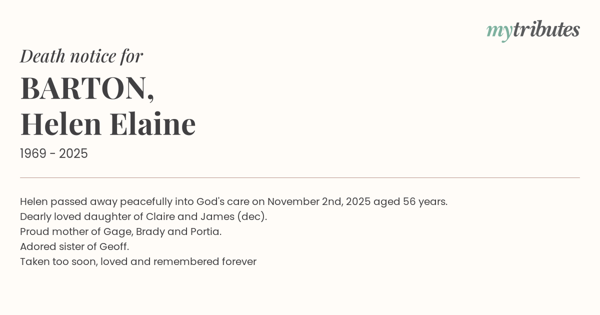 Helen passed away peacefully into God's care on November 2nd, 2025 aged 56 years.
