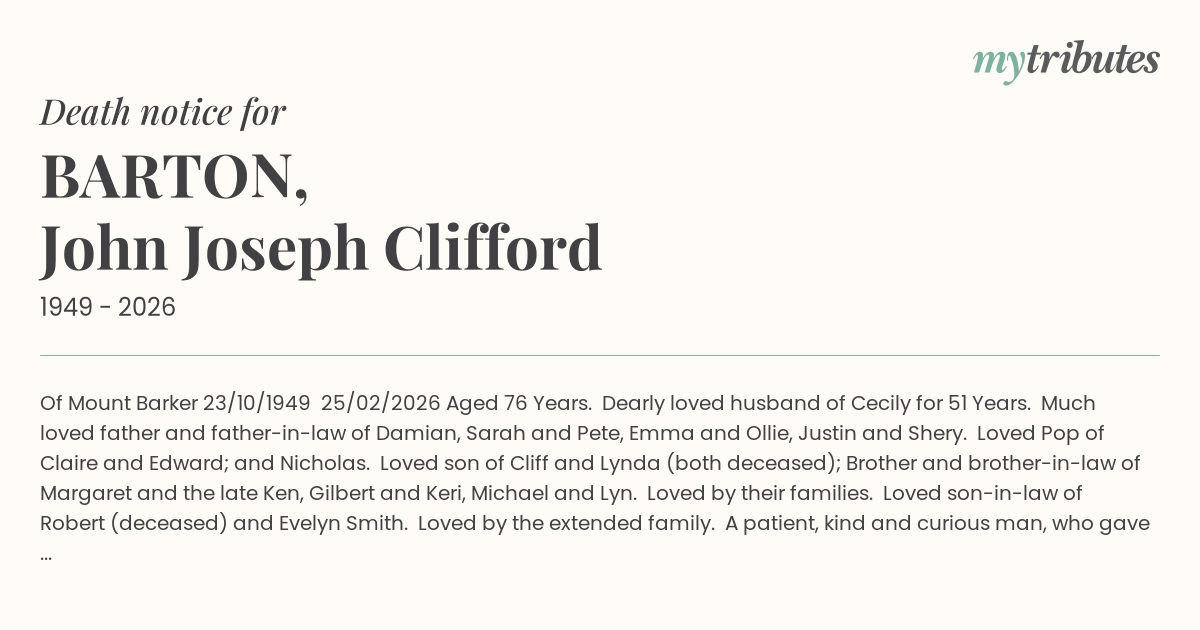 Of Mount Barker 23/10/1949 – 25/02/2026 Aged 76 Years. Dearly loved husband of Cecily for 51 Years. Much loved father and father-in-law of Damian, Sarah and Pete, Emma and Ollie, Justin and Shery. Loved Pop of Claire and Edward; and Nicholas. Loved son of Cliff and Lynda (both deceased); Brother and brother-in-law of Margaret and the late Ken, Gilbert and Keri, Michael and Lyn. Loved by their families. Loved son-in-law of Robert (deceased) and Evelyn Smith. Loved by the extended family. “A patient, kind and curious man, who gave total devotion to his family, his friends and his community” He will be deeply missed by all who knew him.