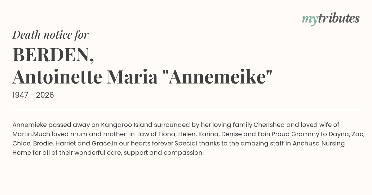 Annemieke passed away on Kangaroo Island surrounded by her loving family.