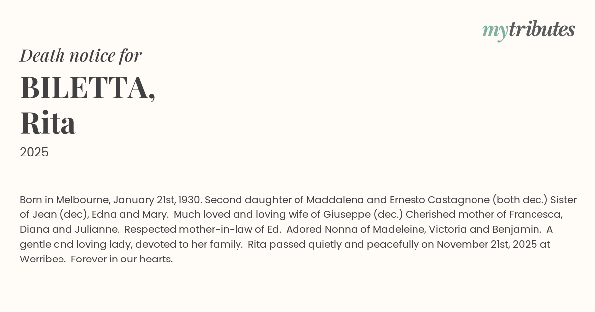 Born in Melbourne, January 21st, 1930. Second daughter of Maddalena and Ernesto Castagnone (both dec.) Sister of Jean (dec), Edna and Mary. Much loved and loving wife of Giuseppe (dec.) Cherished mother of Francesca, Diana and Julianne. Respected mother-in-law of Ed. Adored Nonna of Madeleine, Victoria and Benjamin. A gentle and loving lady, devoted to her family. Rita passed quietly and peacefully on November 21st, 2025 at Werribee. Forever in our hearts.