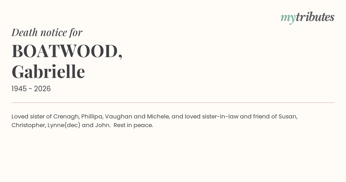Loved sister of Crenagh, Phillipa, Vaughan and Michele, and loved sister-in-law and friend of Susan, Christopher, Lynne(dec) and John. Rest in peace.