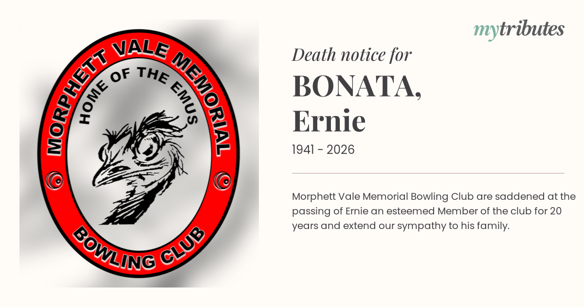 Morphett Vale Memorial Bowling Club are saddened at the passing of Ernie an esteemed Member of the club for 20 years and extend our sympathy to his family.