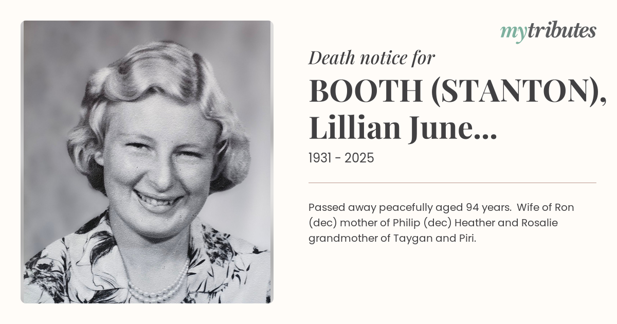 Passed away peacefully aged 94 years. Wife of Ron (dec) mother of Philip (dec) Heather and Rosalie grandmother of Taygan and Piri.