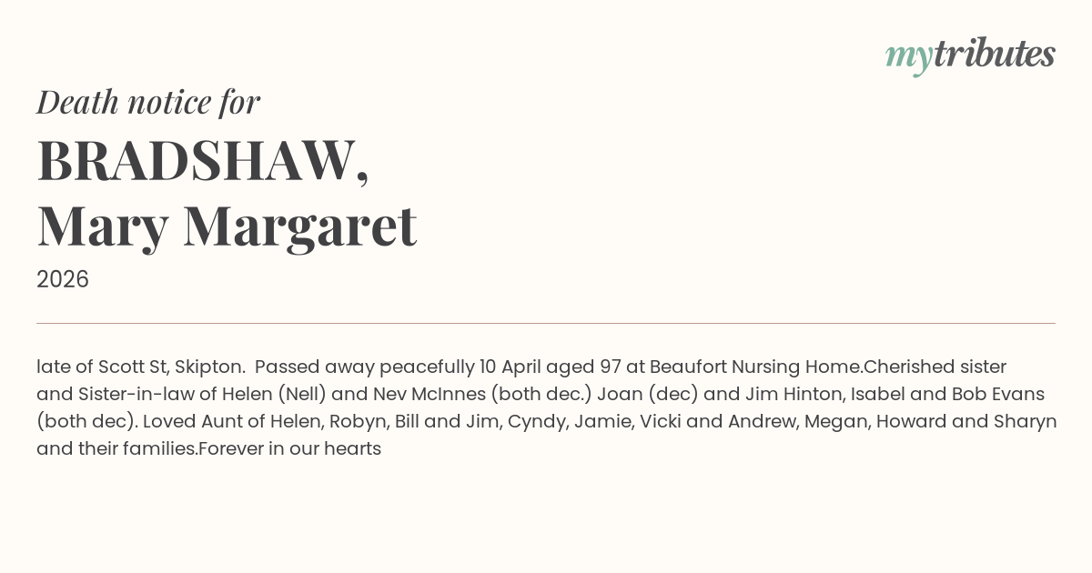late of Scott St, Skipton. Passed away peacefully 10 April aged 97 at Beaufort Nursing Home.