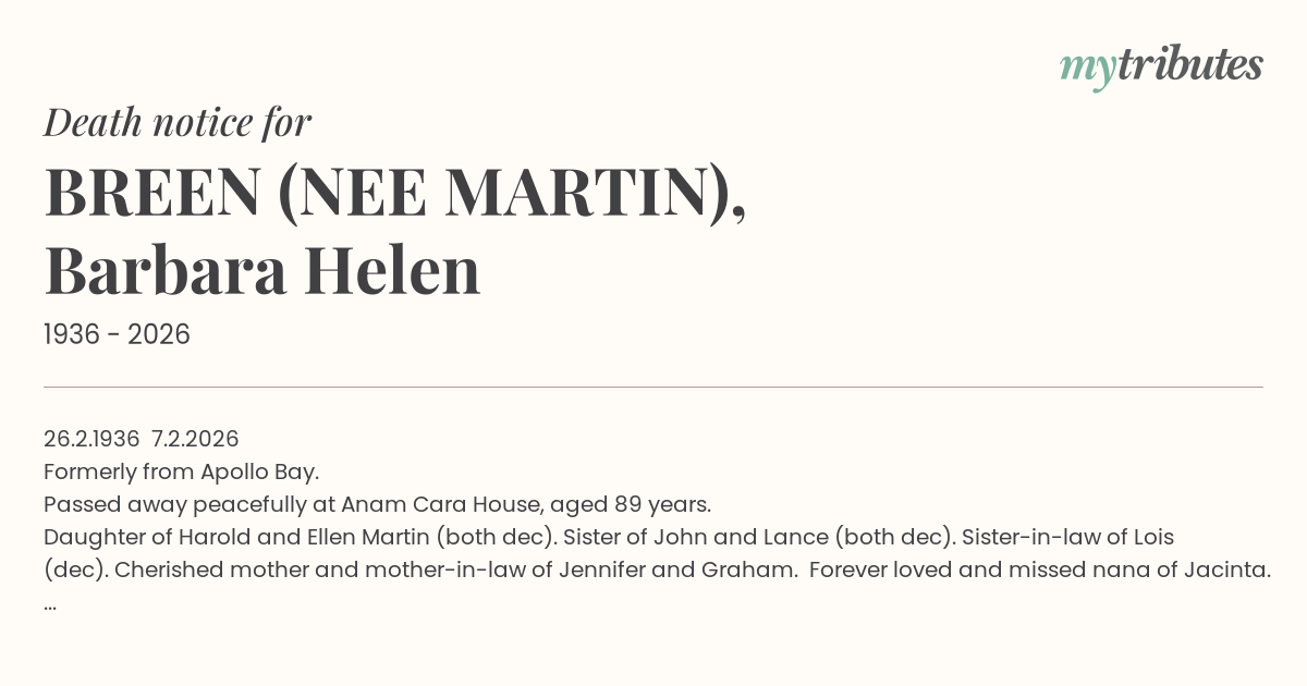 Daughter of Harold and Ellen Martin (both dec). Sister of John and Lance (both dec). Sister-in-law of Lois (dec). Cherished mother and mother-in-law of Jennifer and Graham. Forever loved and missed nana of Jacinta. Treasured and missed nana of Shaun and Emma. Nana nana to Indi, Saylor and Lenny.