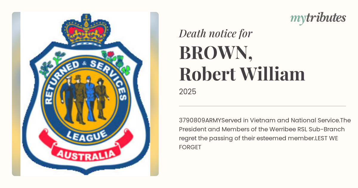The President and Members of the Werribee RSL Sub-Branch regret the passing of their esteemed member.