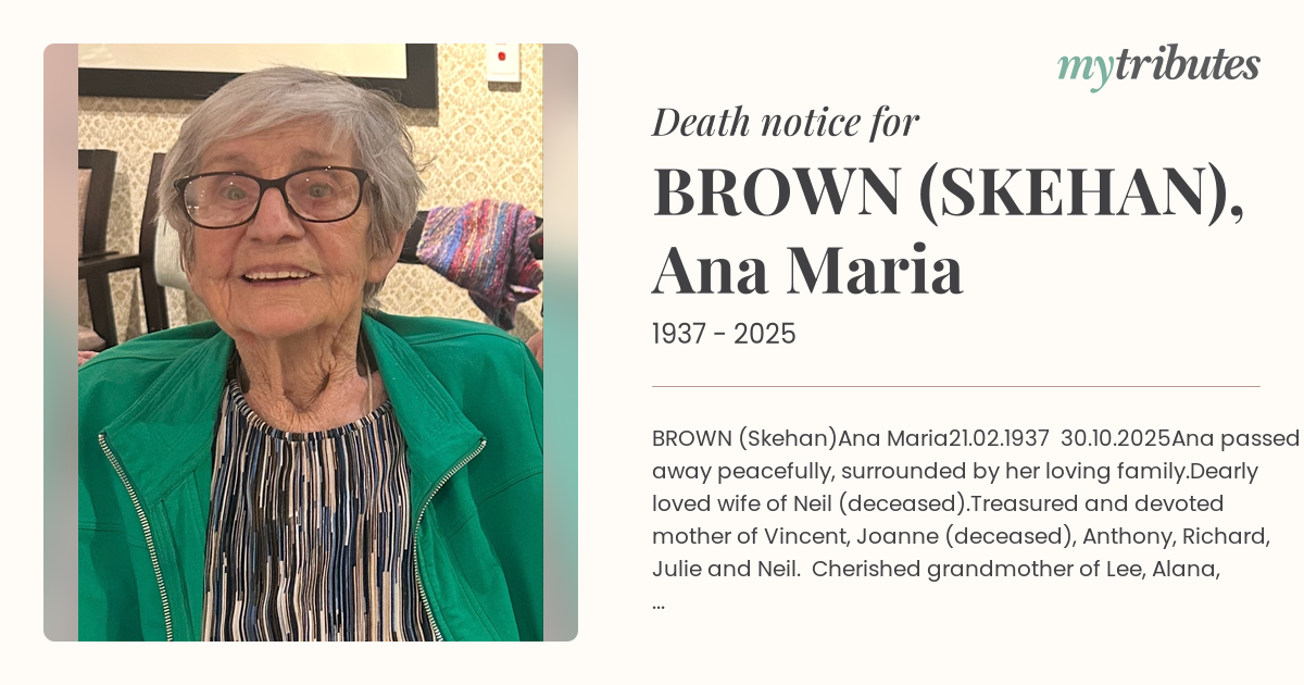 Adored great-grandmother of Harry, Margo and Annie. Ana lived a life filled with love, kindness and devotion to her family. She was the heart and soul of our family — a gentle, compassionate and selfless woman who gave so much of herself to those she loved. Her warmth, generosity and unwavering support touched all who knew her. Forever loved, deeply missed and always remembered with gratitude and affection.