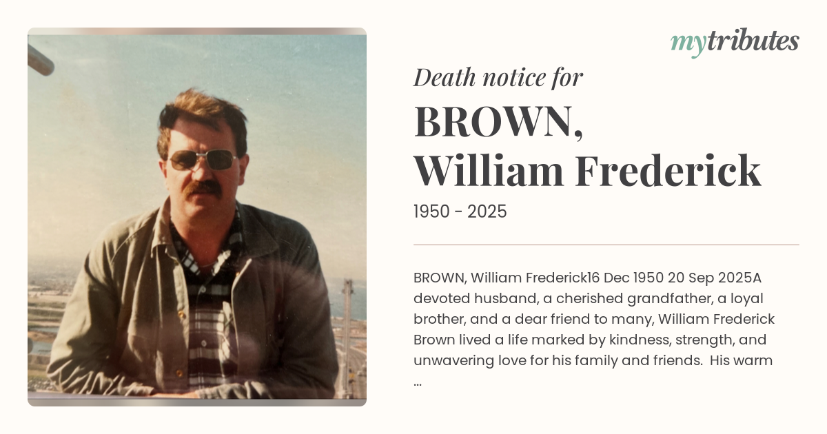 A devoted husband, a cherished grandfather, a loyal brother, and a dear friend to many, William Frederick Brown lived a life marked by kindness, strength, and unwavering love for his family and friends. His warm smile, generous spirit, and sense of humor touched everyone who knew him. He will be deeply missed and forever remembered.
