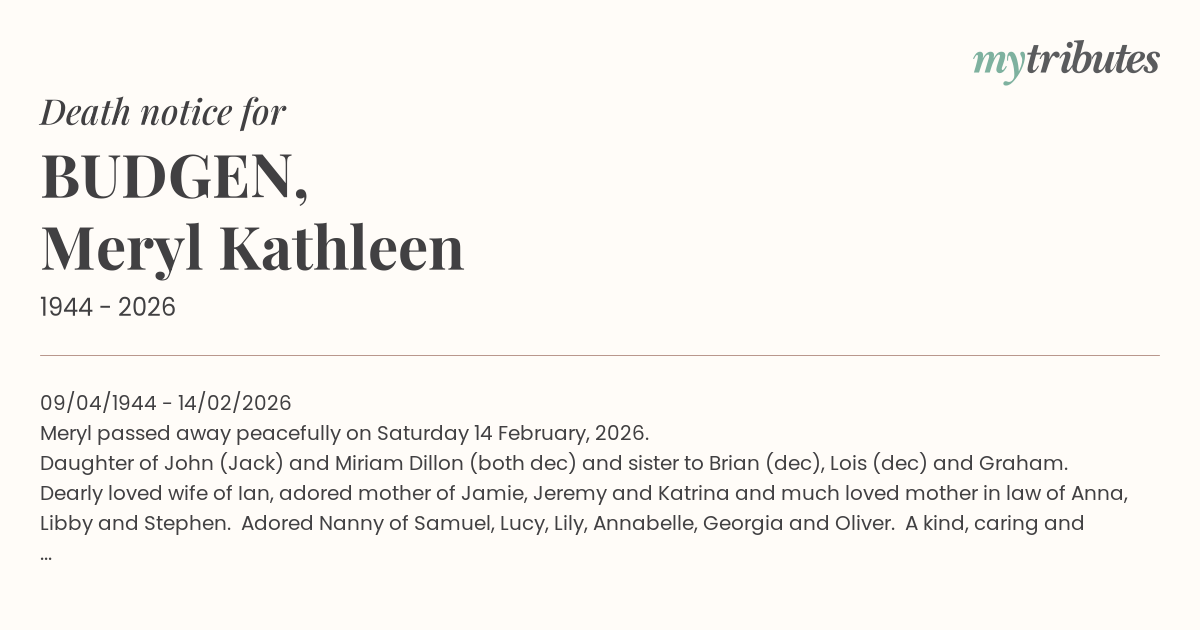 Meryl passed away peacefully on Saturday 14 February, 2026.