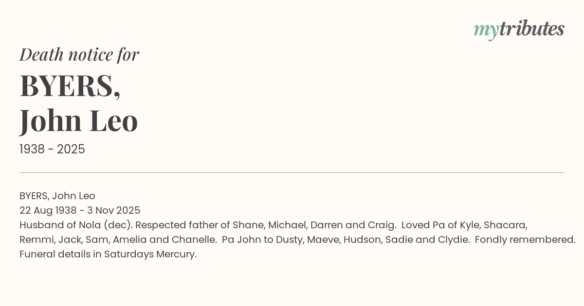 Husband of Nola (dec). Respected father of Shane, Michael, Darren and Craig. Loved Pa of Kyle, Shacara, Remmi, Jack, Sam, Amelia and Chanelle. Pa John to Dusty, Maeve, Hudson, Sadie and Clydie. Fondly remembered.