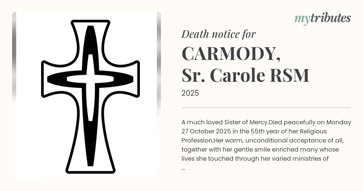 Died peacefully on Monday 27 October 2025 in the 55th year of her Religious Profession.