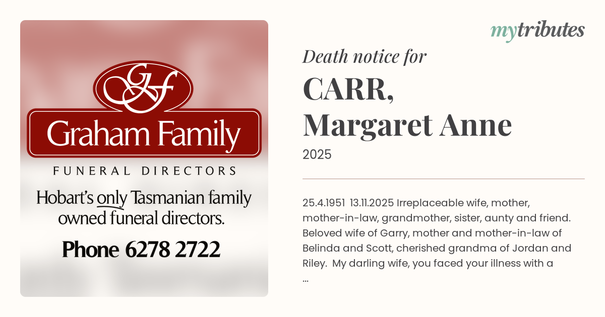 25.4.1951 – 13.11.2025 Irreplaceable wife, mother, mother-in-law, grandmother, sister, aunty and friend. Beloved wife of Garry, mother and mother-in-law of Belinda and Scott, cherished grandma of Jordan and Riley. “My darling wife, you faced your illness with a remarkable courage and grace that inspired everyone around you. You never liked any fuss, always worrying more about others than yourself, right up until the very end. Life without you by my side is unimaginably difficult; you were my best friend, and the light of my life. The pain is deep and real, and there is a void that can never be filled. We find comfort in knowing you are now at peace, free from pain and suffering. You will be forever missed, my love." Special thank you to Marg’s amazing medical team of specialists, doctors and nurses especially Dr Serena Parker and Dr Richard Wood-Baker.