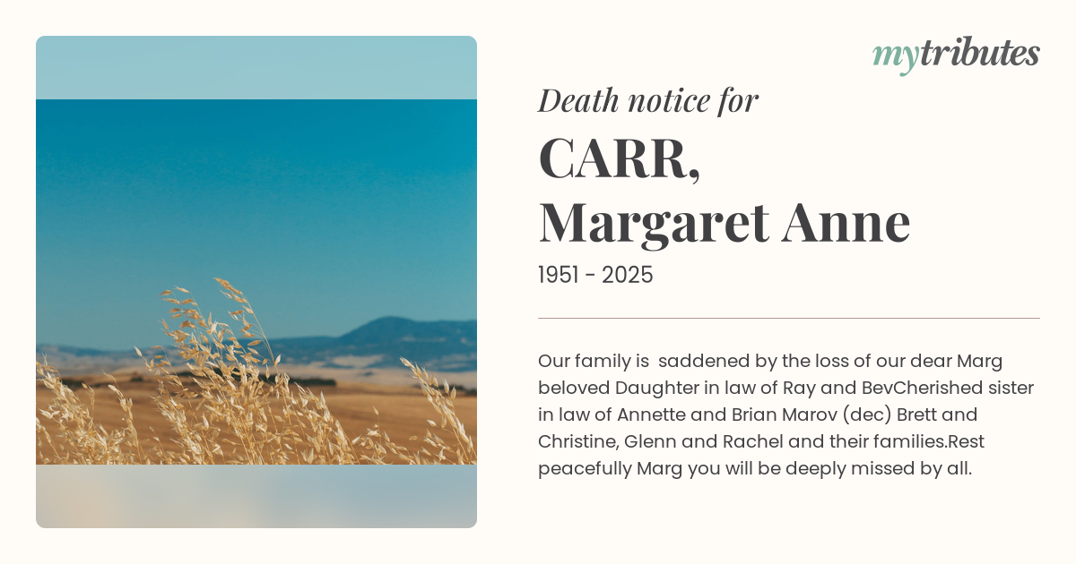 Rest peacefully Marg you will be deeply missed by all.