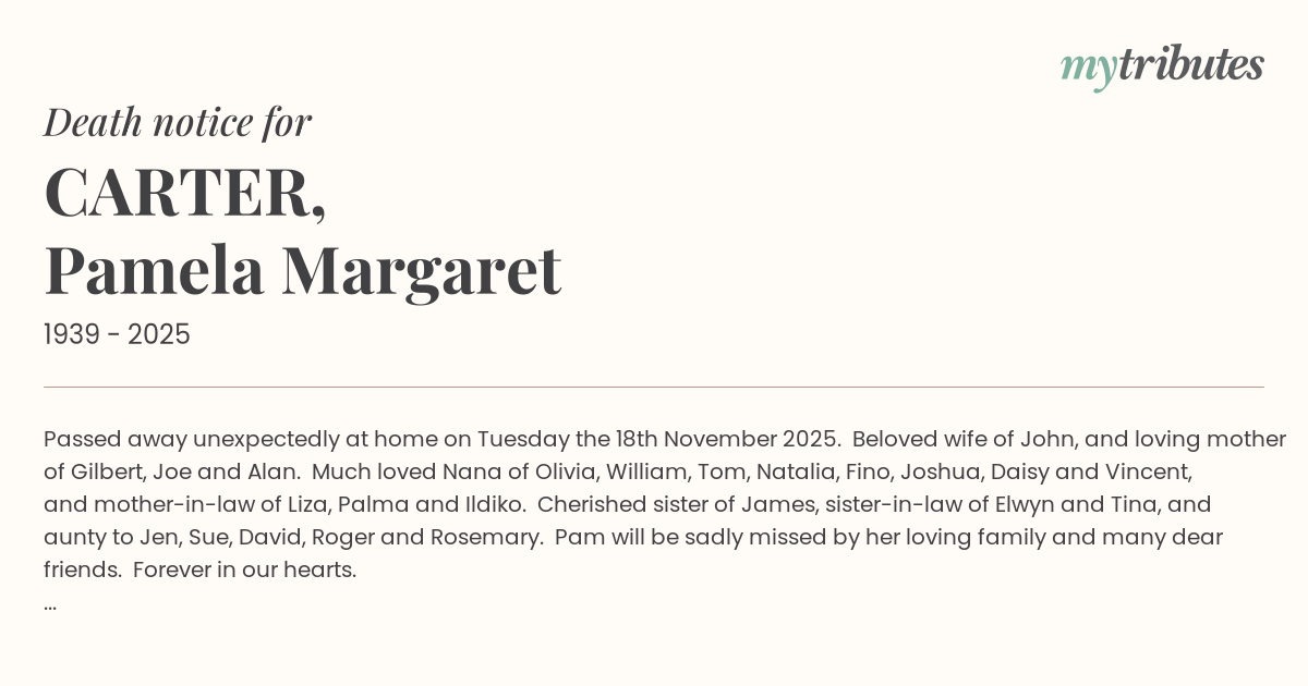 Passed away unexpectedly at home on Tuesday the 18th November 2025. Beloved wife of John, and loving mother of Gilbert, Joe and Alan. Much loved Nana of Olivia, William, Tom, Natalia, Fino, Joshua, Daisy and Vincent, and mother-in-law of Liza, Palma and Ildiko. Cherished sister of James, sister-in-law of Elwyn and Tina, and aunty to Jen, Sue, David, Roger and Rosemary. Pam will be sadly missed by her loving family and many dear friends. Forever in our hearts.
