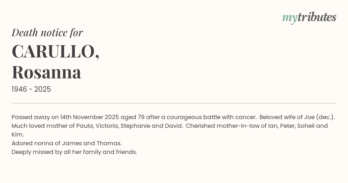 Much loved mother of Paula, Victoria, Stephanie and David. Cherished mother-in-law of Ian, Peter, Soheil and Kim.