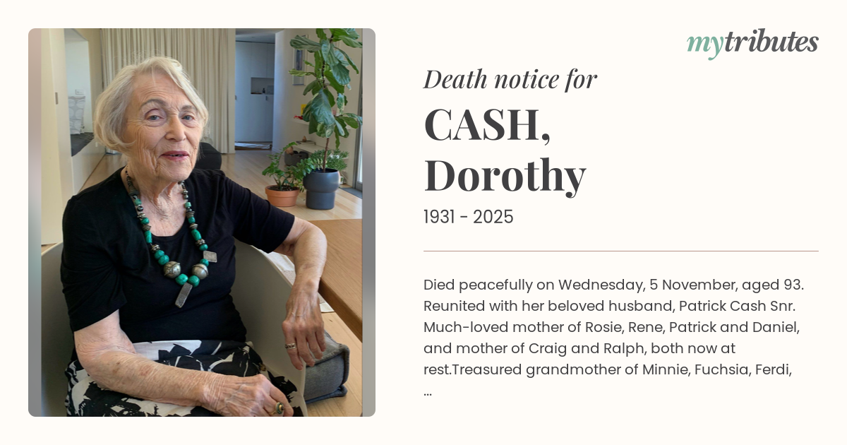 Died peacefully on Wednesday, 5 November, aged 93. Reunited with her beloved husband, Patrick Cash Snr. Much-loved mother of Rosie, Renée, Patrick and Daniel, and mother of Craig and Ralph, both now at rest.