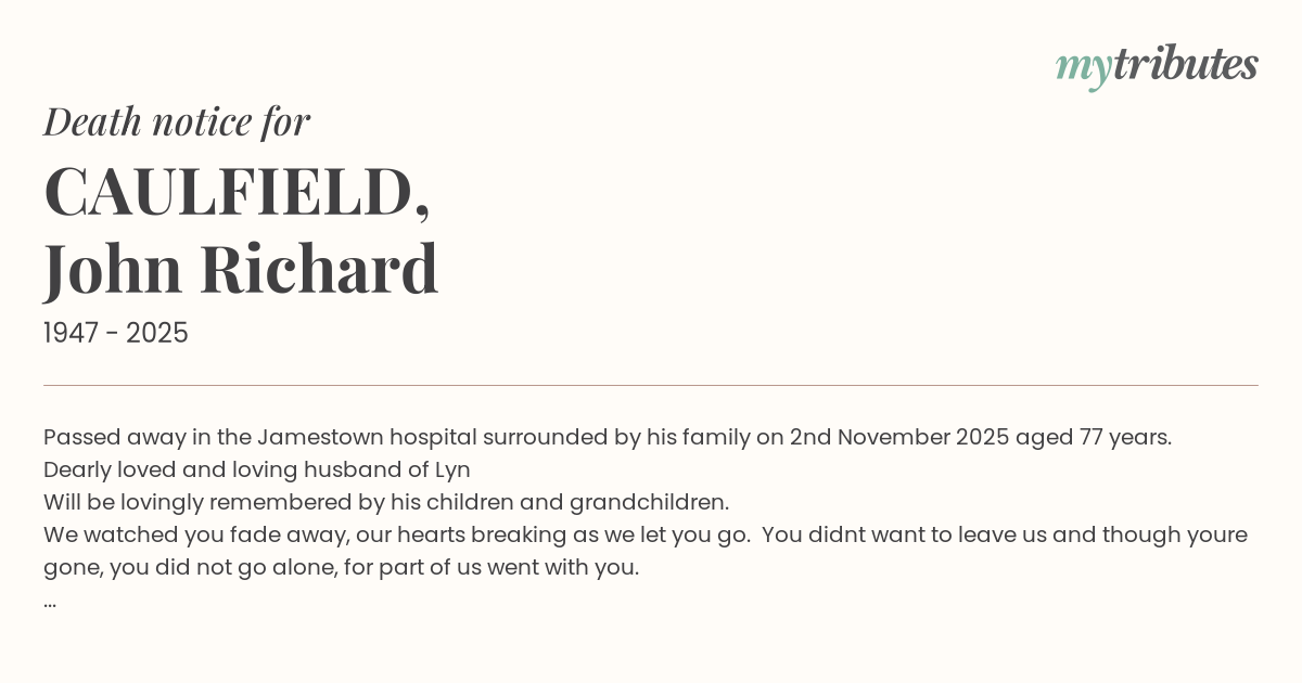 Passed away in the Jamestown hospital surrounded by his family on 2nd November 2025 aged 77 years.