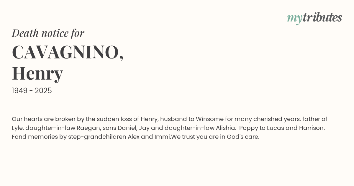 Our hearts are broken by the sudden loss of Henry, husband to Winsome for many cherished years, father of Lyle, daughter-in-law Raegan, sons Daniel, Jay and daughter-in-law Alishia. Poppy to Lucas and Harrison. Fond memories by step-grandchildren Alex and Immi.