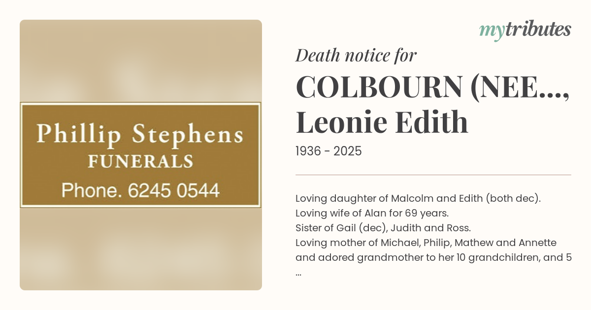 Loving daughter of Malcolm and Edith (both dec). Loving wife of Alan for 69 years. Sister of Gail (dec), Judith and Ross. Loving mother of Michael, Philip, Mathew and Annette and adored grandmother to her 10 grandchildren, and 5 great-grandchildren.
