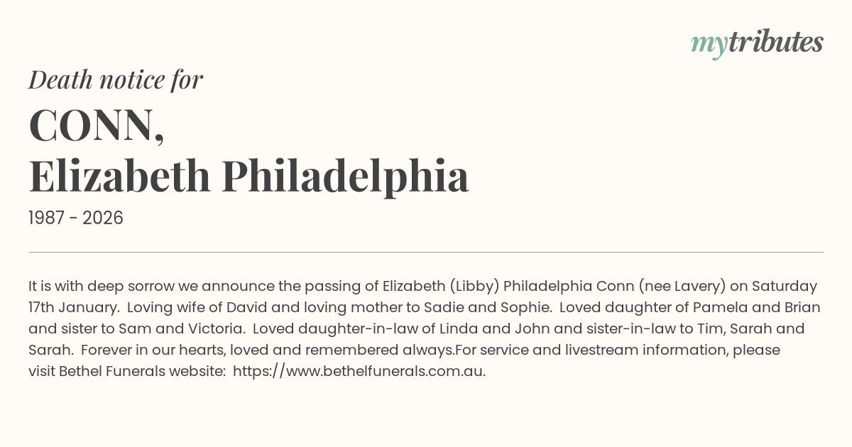 It is with deep sorrow we announce the passing of Elizabeth (Libby) Philadelphia Conn (nee Lavery) on Saturday 17th January. Loving wife of David and loving mother to Sadie and Sophie. Loved daughter of Pamela and Brian and sister to Sam and Victoria. Loved daughter-in-law of Linda and John and sister-in-law to Tim, Sarah and Sarah.